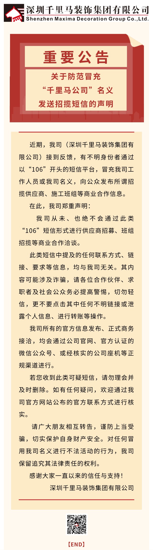 關于防范冒充”千里馬公司“名義發送招攬短信的聲明